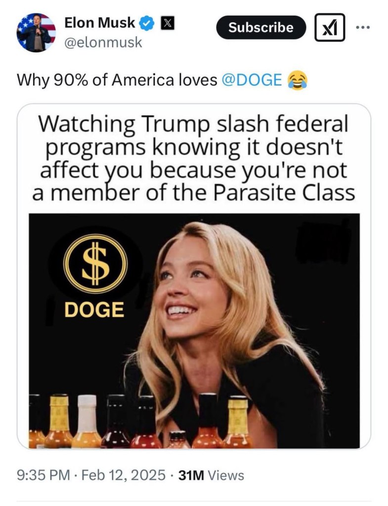 “Elon just called every federal employee, and everyone who benefits from a federal program, a parasite.“