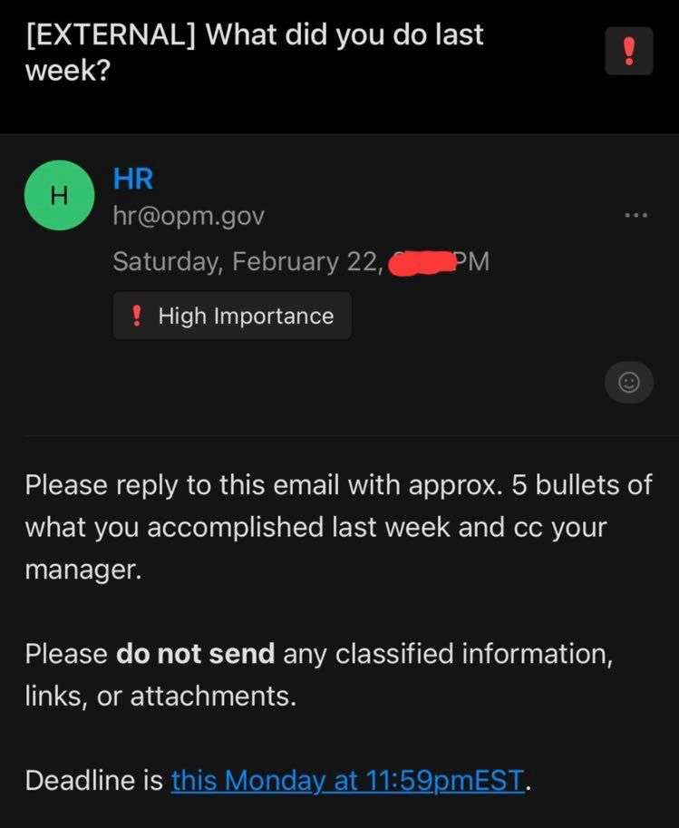 So why do we need to list five things we did? If it’s just a pulse check, why not just respond with “what’s up?” or “howdy”? Remember, a month ago we had the ability to resign from our job by email. We will get an 8 month deferred resignation by just putting the word “resign” in an email to OPM. But now, suddenly, they don’t know if we’re alive unless we write five bullets?