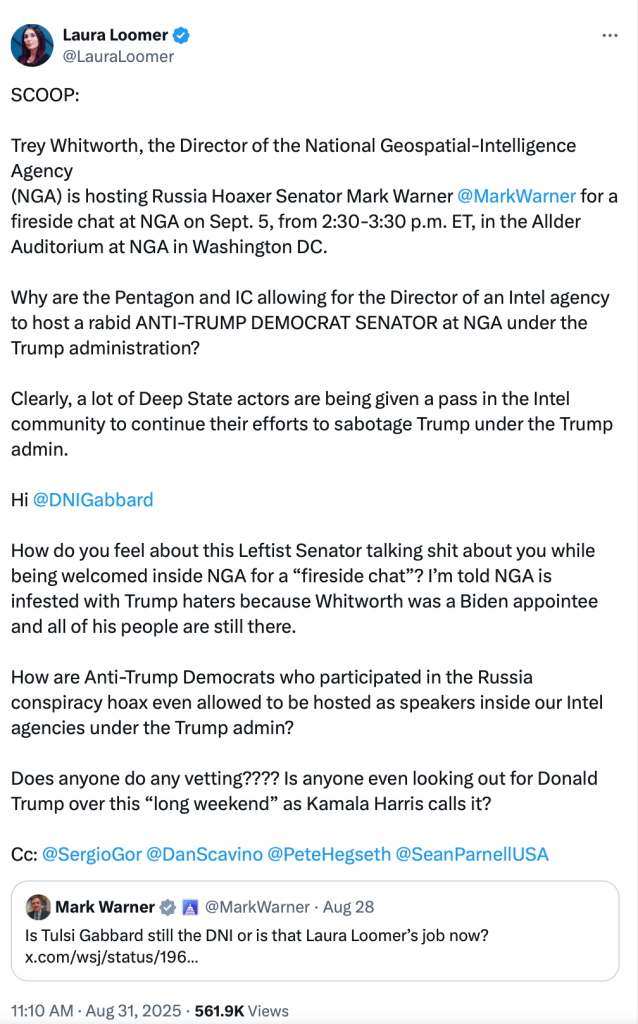 And while Laura Loomer is a crazy whackjob who holds no office and has not been appointed or elected to anything, she somehow had enough inside information and pull to find out about today’s planned meeting between Whitworth and Senator Mark Warner, ranking member of the Senate Intelligence Committee, and and get it canceled.
