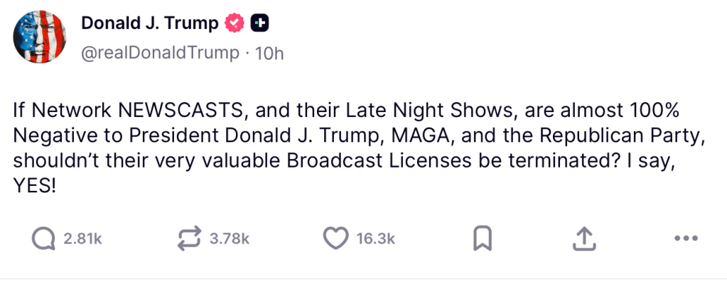 Calling for the network’s broadcast licenses to be terminated because comedians dare to speak against him? Because the newscasts reports on the horrible things his regime is doing?